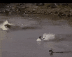 有一只小鹿正在过河,但是突然出现了一条鳄鱼。本来正在岸边的鹿妈妈,以她此生最快的速度往水里游去。