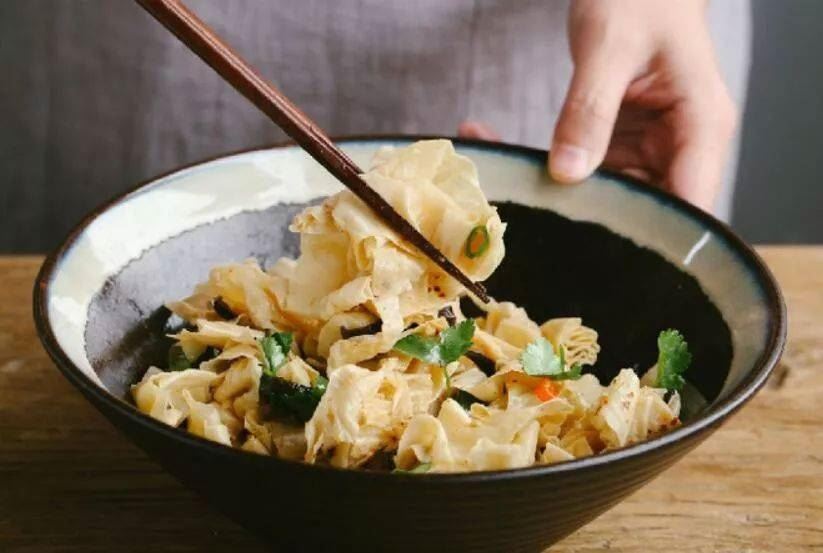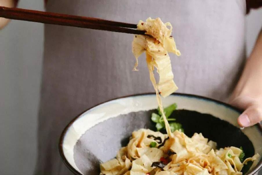 不同于腐竹,鹰嘴豆皮会先将泡发好的豆子放入机器混合鹰嘴豆粉磨成糊状,再直接进行挤压,这一环节的创新使得豆皮口感酥脆、豆香浓郁,微微泡发就可以入菜,口感比腐竹更劲道。
