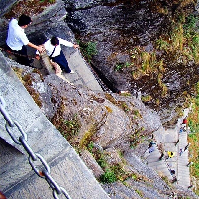 在中国的西南方,就有两座极其惊险的“房子”:它建在山体有10亿年历史、海拔2494米、坡度90°的悬崖之顶,只有拉着铁链才能爬上金顶。