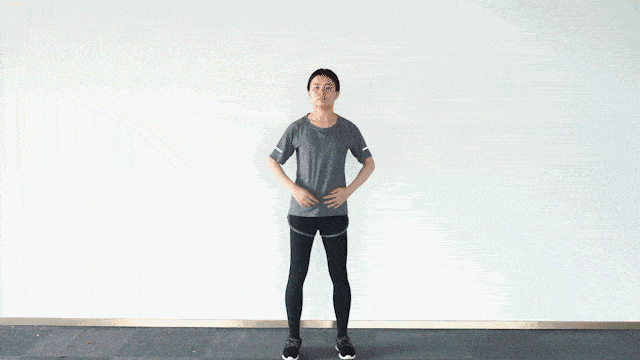 3、甩到第五下,手往后甩的同时双膝微微下蹲,轻松的上下弹动两次。