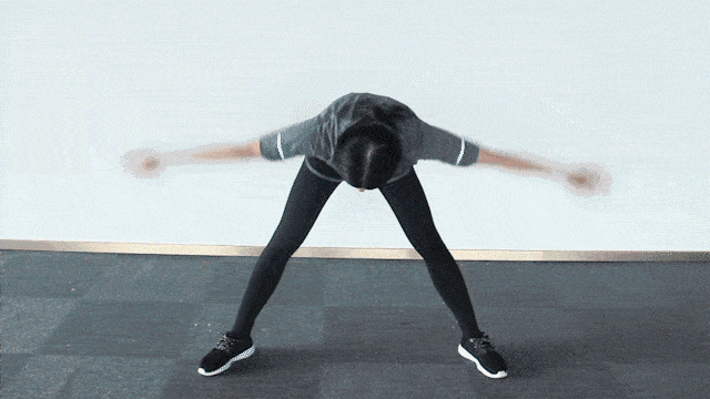 扎马步,十趾轻轻抓地,微微提肛,舌抵上腭。缓缓上抬手臂至与肩平行,再自然甩落至身后,来回反复。