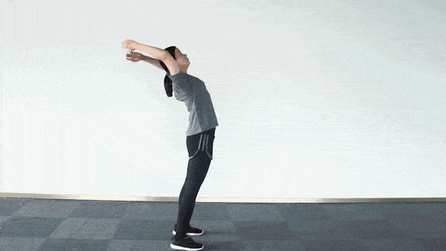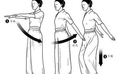 练习时需站立,肩松,两手臂下垂伸直于体侧,双手臂前伸上抬,甩至头顶上方,同时配合挺胸仰头,再将双臂返回前甩至下后方,同时配合伸腰低头活动,如此连续甩手7~14次。