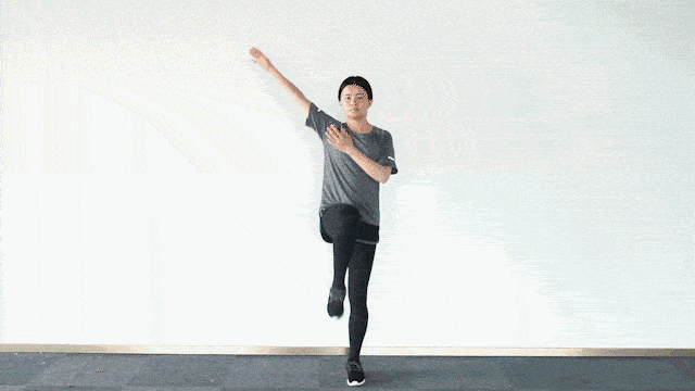 双臂轮流向身体一侧上抬,向右抬时,右腿也一起配合上提,反之亦然。