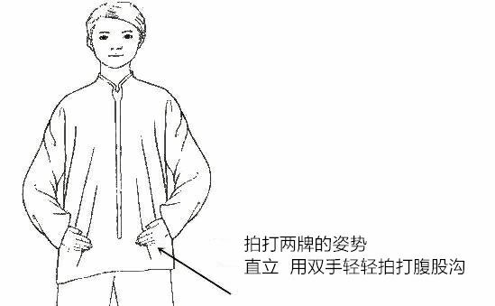 方法:站立,两脚分开与肩同宽, 膝盖微微弯曲,感觉脊椎末端的尾巴骨向里蜷起来(平时如果久站腰酸的人,也可以这样站,便于受力,也保护自己),从肩膀甩起来,利用惯性用双手拍打大腿内侧与小腹交接处的腹股沟部位, 由轻到重,逐渐加力,直至腹股沟微微发热为止。最好每天拍打两到三次,每次5~10分钟。