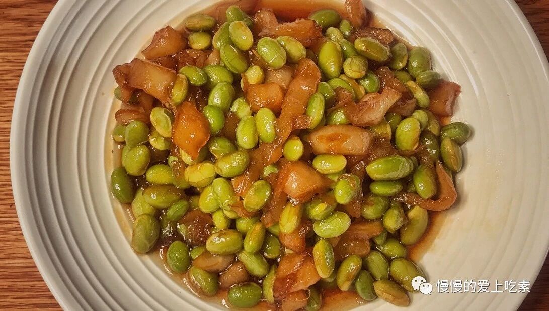 2.锅内放入植物油,中火焙油,放入萝卜干和毛豆,随即放入原浆酱油和清酒,加入适量清水沒过食材。