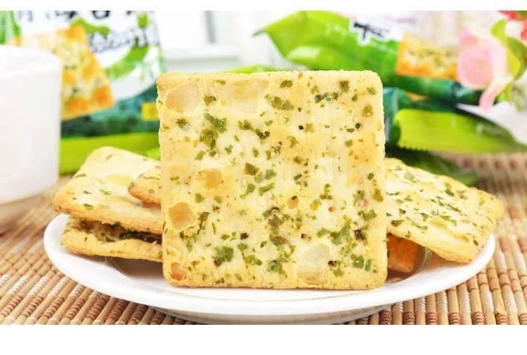 咸味苏打饼干,清新的海苔香气,星星点点的缀满饼干整个饼,咸鲜可口,含在嘴里可感受大海的味道。