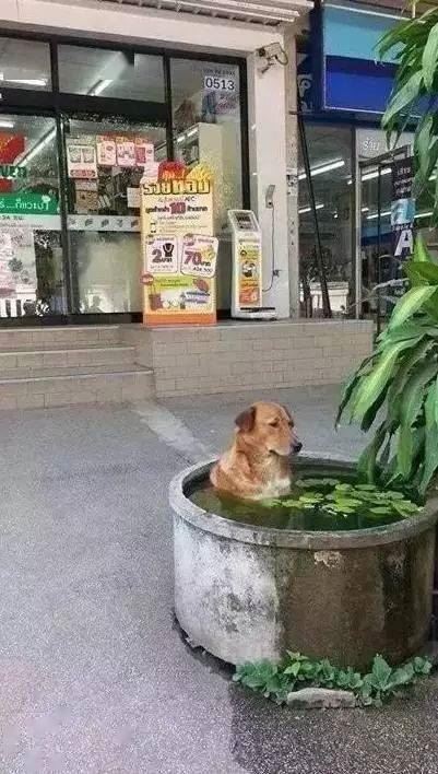因为天气炎热,有的狗狗直接跳进了超市门口的小水池里,来个凉水澡,看上去还有点好笑。
