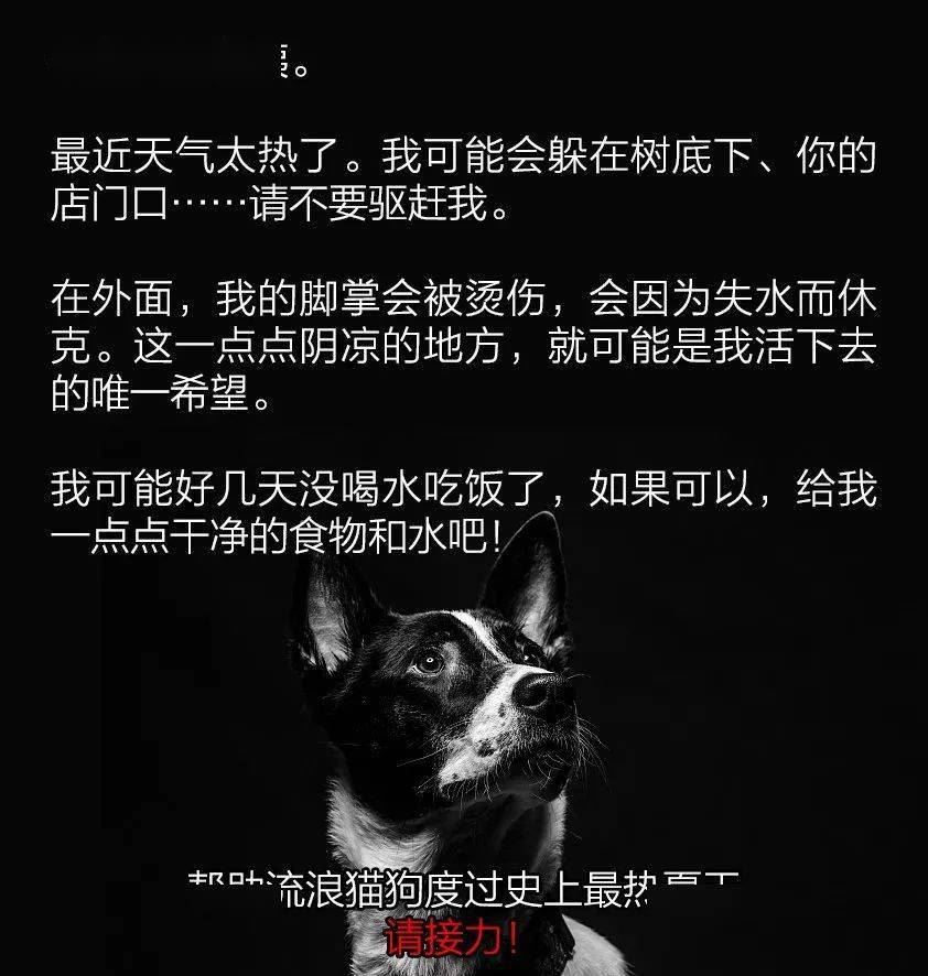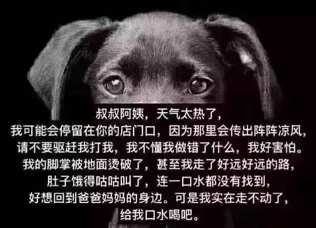 叔叔阿姨,哥哥姐姐,天气太热了,我可能会停留在你的店门口,因为那里会传来丝丝凉风, 请不要驱赶我,打我,我不懂我做错了什么,我好害怕,我的脚掌被地面烫破了,甚至我走了好远好远的路,肚子饿得咕咕叫,离一口水都没有找到,好想回到爸爸妈妈的身边,可是我实在走不动了!