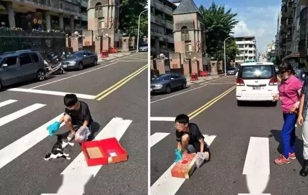 这位中国台湾的男生,在马路上看到一只因车祸丧生的流浪猫,不忍心看它在烈日下暴晒,用纸盒将它带走,送它最后一程...