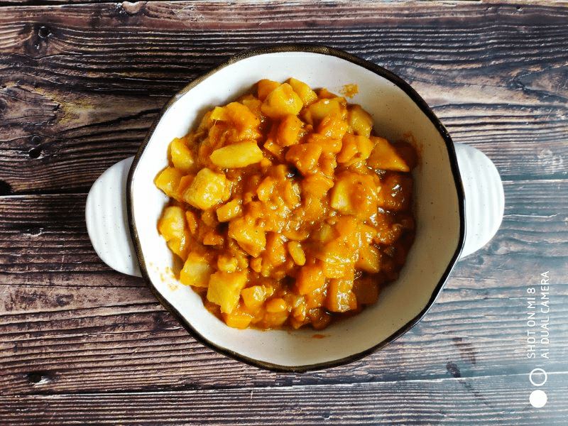 3. 加入南瓜和土豆丁翻炒,翻炒到8分熟;