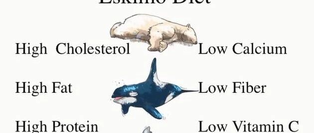 爱斯基摩悖论是,为何高脂肪, 高蛋白,高胆固醇, 鲜有蔬食和膳食纤维的饮食却没有心脏病。