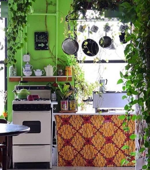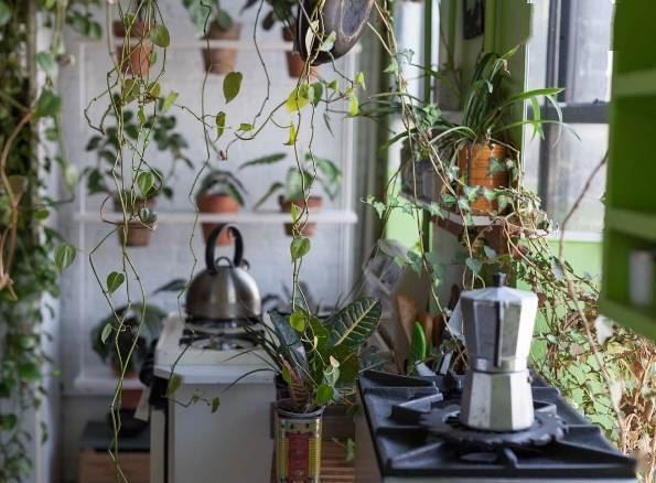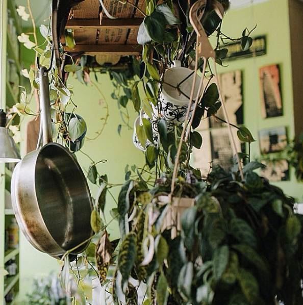 你看,厨房的锅子被缠绕得越来越密,藤蔓和枝叶在10英尺高的天花板上弯曲,垂下来成了一道帘子,过不多久大概都找不到锅子了吧。