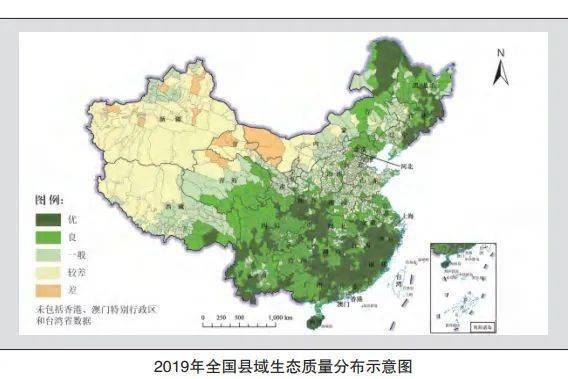 2019年,全国生态环境状况指数 *(EI)值为51.3,生态质量一般,与2018年相比无明显变化。生态质量优和良的县域面积占国土面积的44.7%,主要分布在青藏高原以东、秦岭—淮河以南、东北的大小兴安岭地区和长白山地区;一般的县域面积占22.7%,主要分布在华北平原、黄淮海平原、东北平原中西部和内蒙古中部;较差和差的县域面积占32.6%,主要分布在内蒙古西部、甘肃中西部、西藏西部和新疆大部。