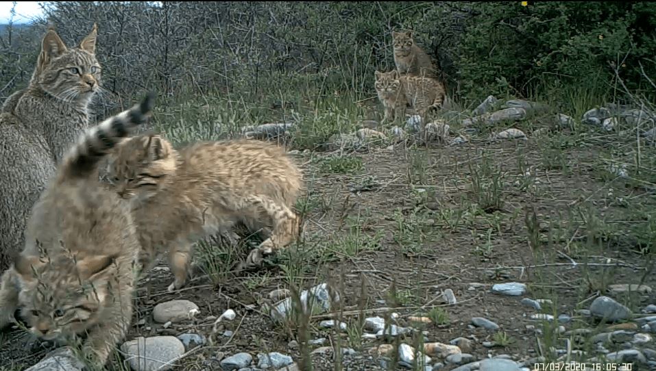荒漠猫为中国所有猫科动物中仅有的特有物种,《世界自然保护联盟》(IUCN)濒危(EN)物种,荒漠猫在全国数量稀少,分布密度低,对其生活史所知甚少。其通常栖息于海拔2500米至5000米干燥的高山与亚高山灌丛、戈壁、草甸生境中。自祁连山国家公园青海省管理局启动荒漠猫专项调查以来,在国家公园范围内频繁记录到荒漠猫活动画面,并且记录到一只雌性荒漠猫成功抚育4只幼崽的画面,监测到5只荒漠猫同框的罕见画面。祁连山国家公园青海片区自开展猫科动物专项调查以来,记录到5只雪豹同框、6只兔狲同框的罕见画面后又一次记录到猫科动物多只同框的画面。