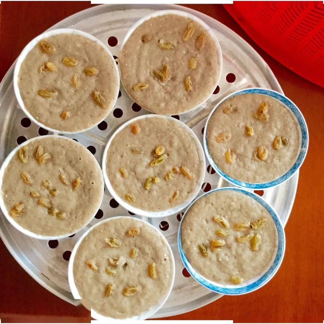 2.加入粘米粉和水搅匀,根据个人口味加入适量的糖和葡萄干,入碗隔水蒸;