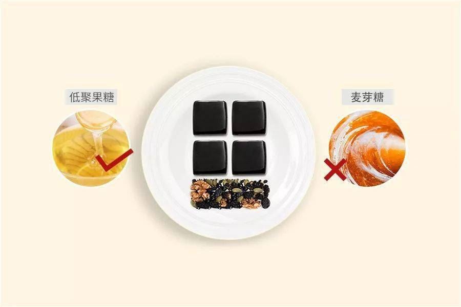 新品芝麻味黑糕原料中用低聚果糖取代麦芽糖,相比于蔗糖、麦芽糖,低聚果糖有以下的优势: