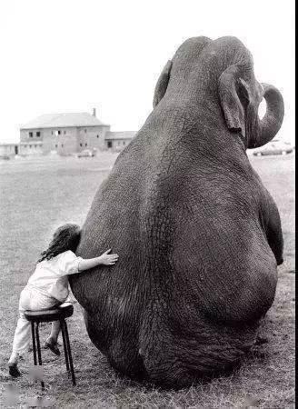 8、小女孩坐在凳子上,亲昵地抱着身边的大象,一大一小两个背影,看起来如此和谐美好。