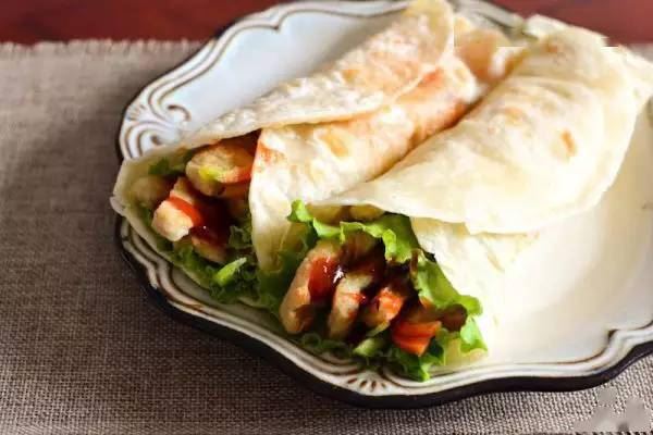 5.依次在面饼上铺上生菜,青红椒和素肉块