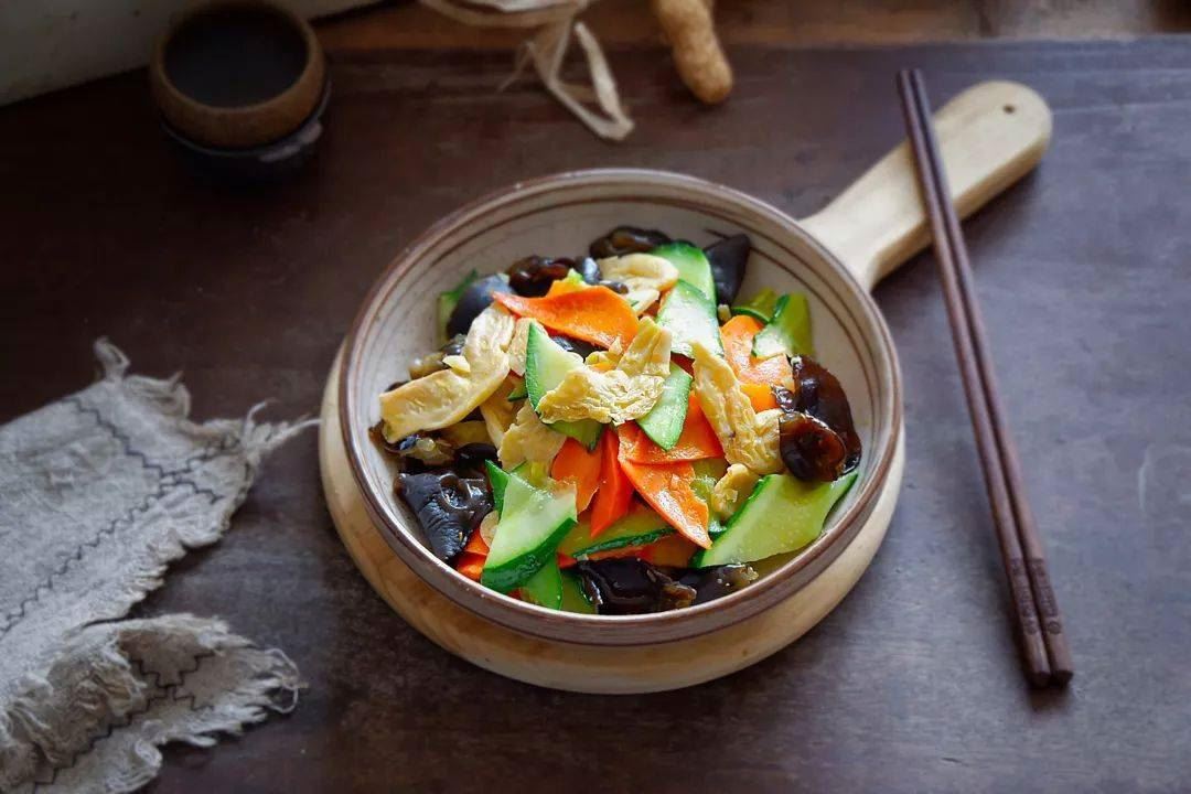 6. 下素肉丁翻炒片刻,下黄瓜,胡萝卜炒至断生