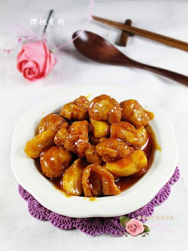 8.烧至汤汁浓缩粘稠,倒入炸好的素肉和荸荠,快速翻炒均匀即可