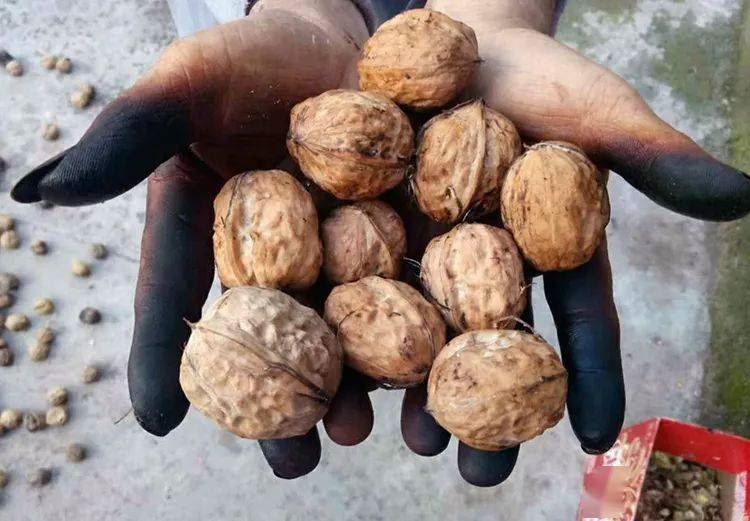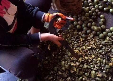把鲜核桃从绿衣里取出来并不是一件容易的是,青皮汁液和容易上色, 果农们拒绝药水浸泡脱皮漂白,每次剥完皮双手都被染成黄黑色,很多就难以褪去。