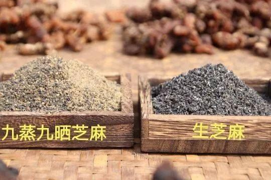生芝麻是皮为黑色,仁却是白色的。如果打成粉,颜色是介于灰色的。九蒸九晒,芝麻的仁是一遍色比一遍深,从白色到黄色,最后到褐色。而且油份是一遍比一遍少。