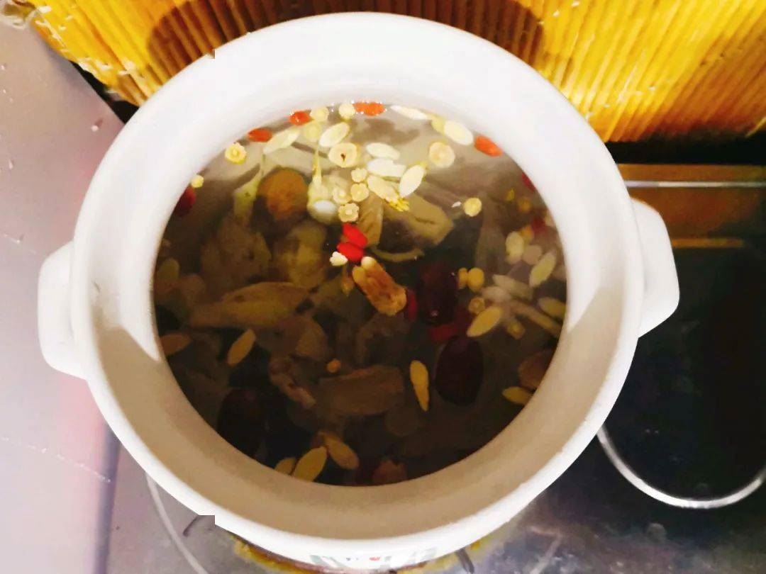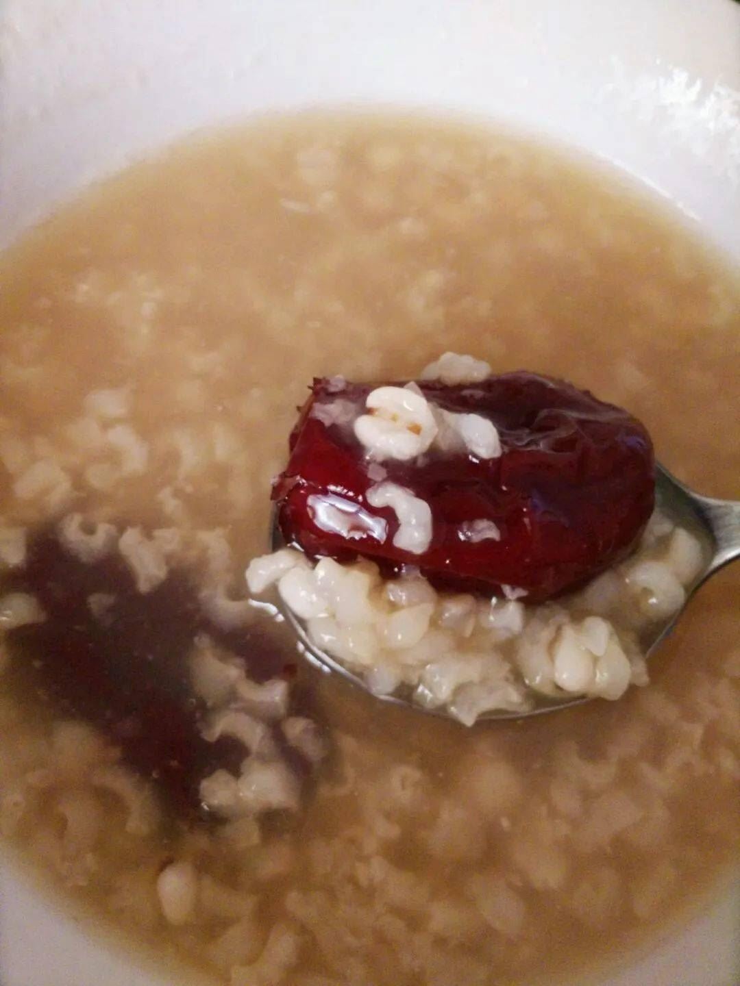 2. 药汁好后,去除药渣,将炒薏米、炒扁豆、红枣肉、枸杞、大米一同放进药汁中煮沸,后用文火煮成粥。