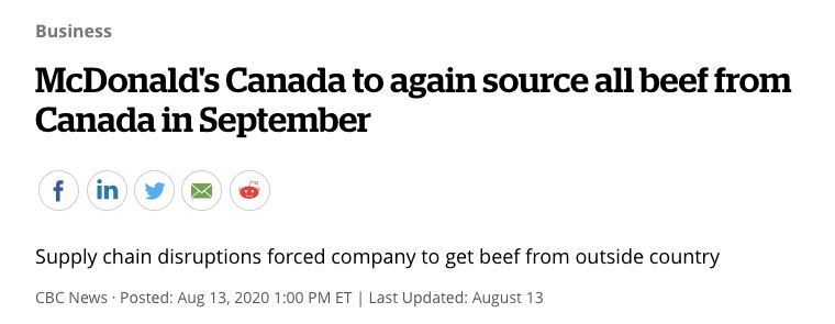 而麦当劳加拿大公司不久前(上周四)宣布, 麦当劳9月开始将重新选用加拿大牛肉,几个月前,由于加国肉工厂COVID-19爆发,导致供应链中断,麦当劳选择从国外引进肉类。