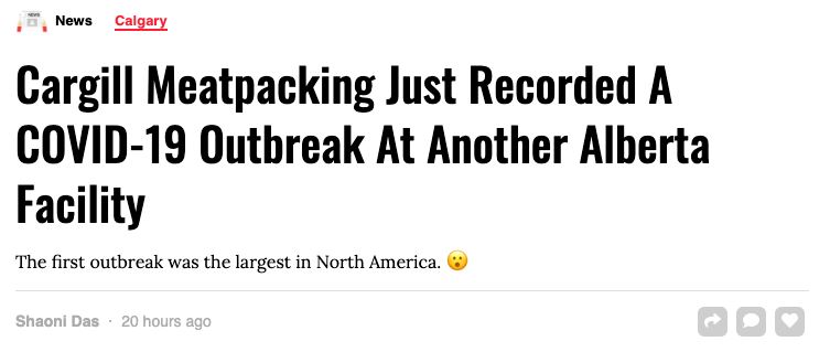 阿尔伯塔省第一次发生在嘉吉(Cargill)的COVID-19疫情,是在他们位于High River的肉类包装工厂发生的。