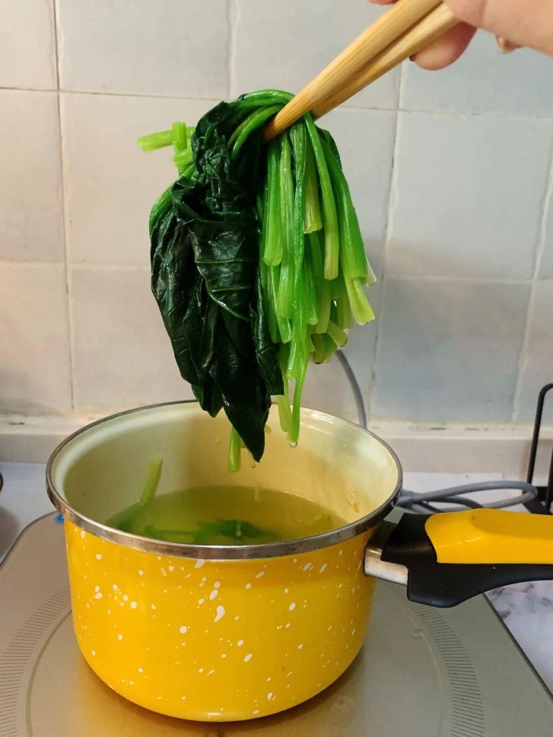 此外,菠菜根膳食纤维丰富,不易煮熟, 教大家一个妙招——水煮开,先将菠菜的根部煮40秒,再把整棵菠菜放入沸水中。