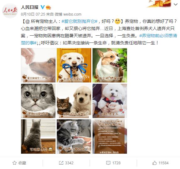 @所有宠物主人:#爱它就别抛弃它#,好吗?养宠物,你真的想好了吗?心血来潮把它带回家,却又狠心将它抛弃…近日,上海查处首例养犬人遗弃犬只案,一宠物狗因患病在酷暑天被遗弃。一旦选择,一生负责。#养宠物前必须想清楚的事#↓↓呼吁倡议: 如果决定接纳一条生命,就请负责任地陪它一生!