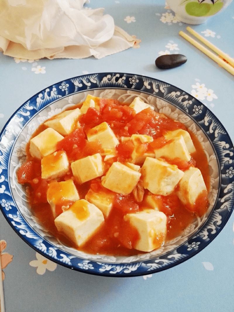 5. 当西红柿熬出红汁,将豆腐倒入锅中翻炒;