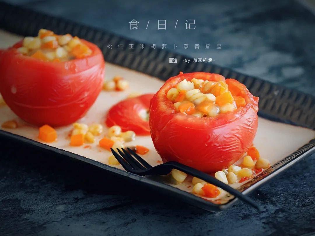 1. 西红柿洗净切去底部,掏出内瓤,得到西红柿盅,挖出的瓤可以凉拌,也可以做其他菜肴;