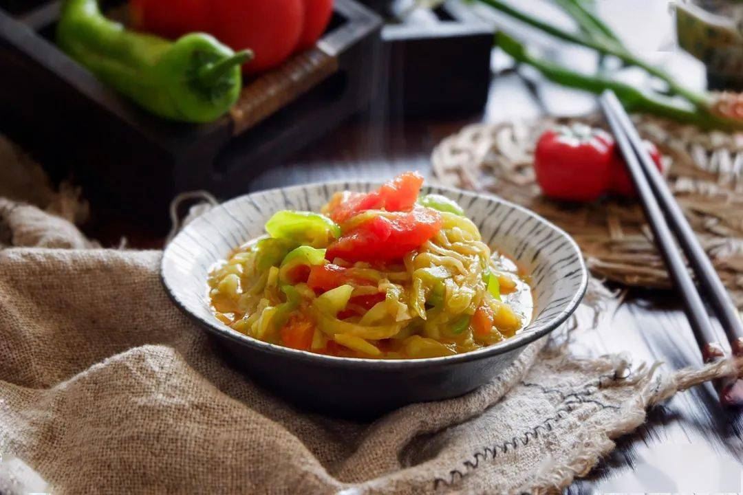 1. 将茄子去皮,切成细丝;番茄去皮,切成小块;尖椒切成丝,姜切末;