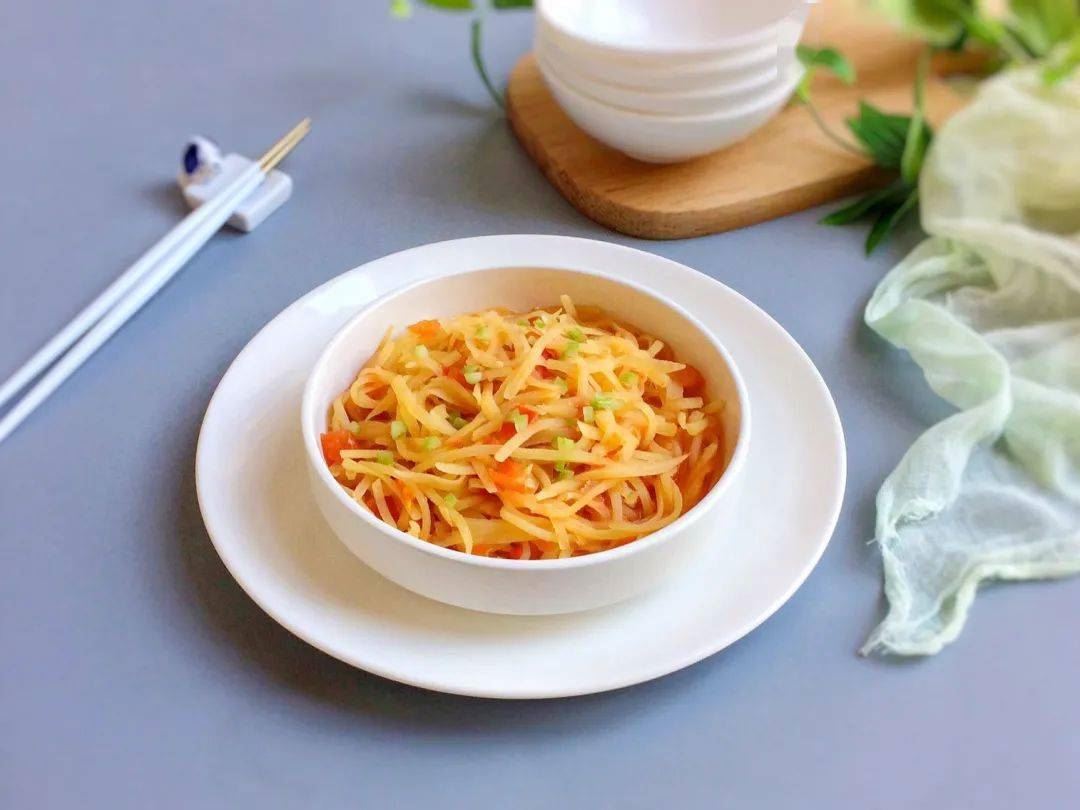 1.土豆去皮切丝,倒入水中浸泡10分钟;