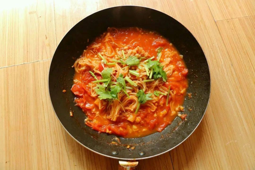 1. 金针菇去蒂,洗干净,西红柿切丁;