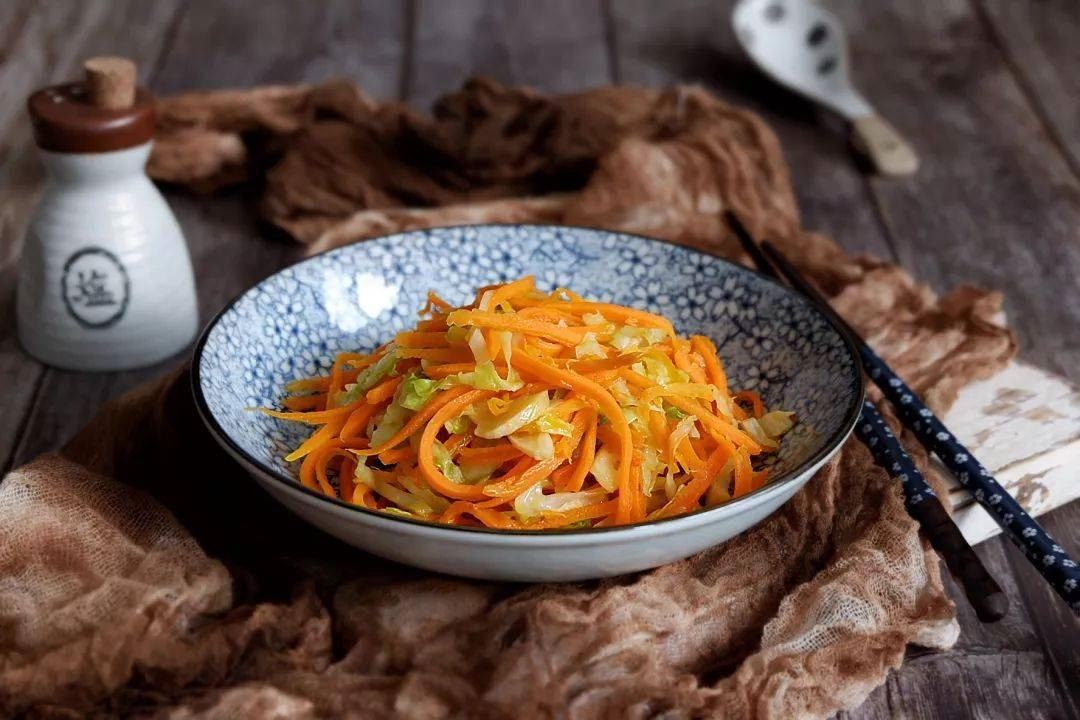 3、加入胡萝卜和包菜,慢慢翻炒至断生