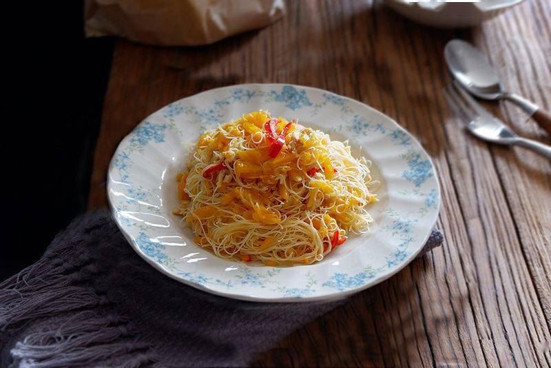 南瓜300g,米粉100g,红椒20g,生抽1汤匙,盐1茶匙,植物油适量