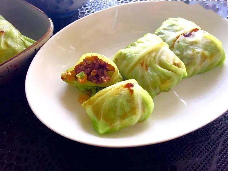 1. 包菜叶~放入加了白醋和少许盐的沸水中焯熟焯软~取出沥干水分备用;
