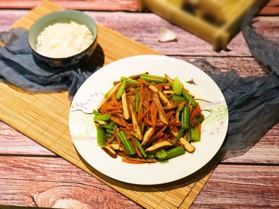 1.芹菜切段,胡萝卜切丝,香干切丝,姜切丝备用;