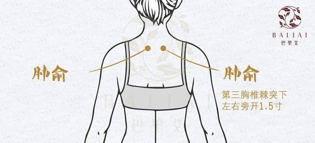 肺俞穴:位于人的背部,第三胸椎棘突下,旁开1.5寸的部位,乃背部奇穴。