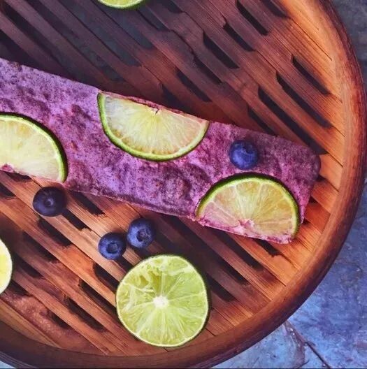 2. 浸泡过的生腰果,蓝莓,巴西莓,奇亚籽和海盐与30m至50ml左右的枫糖浆(按口味较少增加)放入料理机打成柔滑的奶油状,如果不够顺滑,可以加入少量纯净水或者椰汁 导入模具,切片青柠装饰,冷冻至成型,食用时放置冷藏解冻。