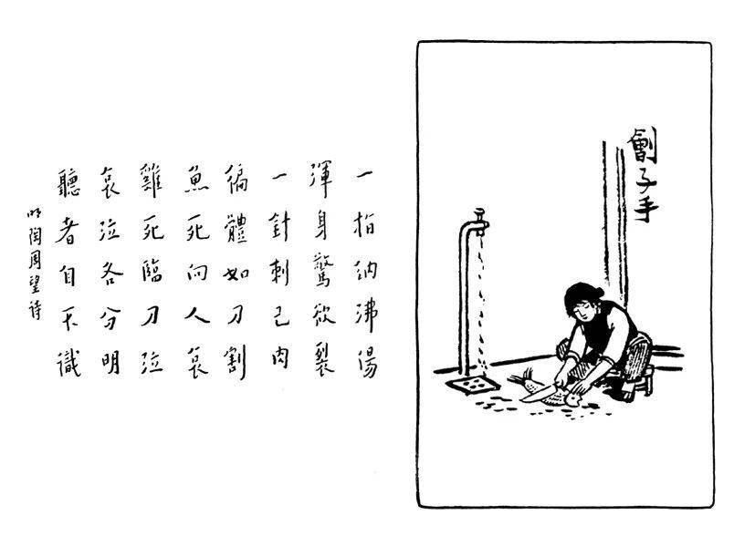 这幅以“刽子手”命名的图画,画中的刽子手指的是人,但是前两句诗“一指纳沸汤,浑身惊欲裂”,确是将心比心,道出一个人,试着将手指头探入沸滚的热汤中,那种剧痛,令人浑身犹如撕裂般痛楚。