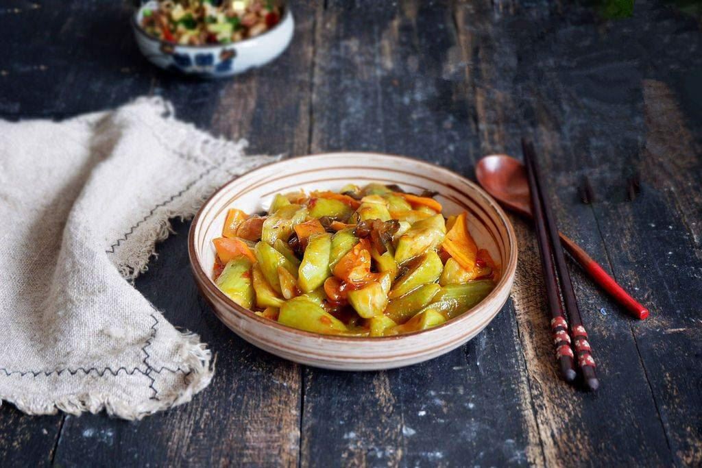 1. 冬瓜去籽去皮,切成方块。一侧切几条凹槽、另一侧涂老抽。