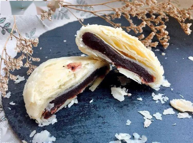 10.用擀面杖擀成圆形,取一份豆沙放上面