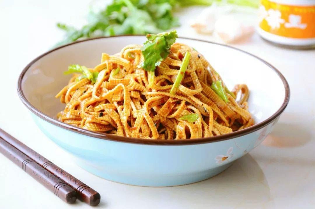 4.平底锅倒入橄榄油50克烧热,放入腐皮卷,煎至两面色泽金黄取出,切成3厘米长的段摆盘,上菜时配一碟酸梅酱即可。