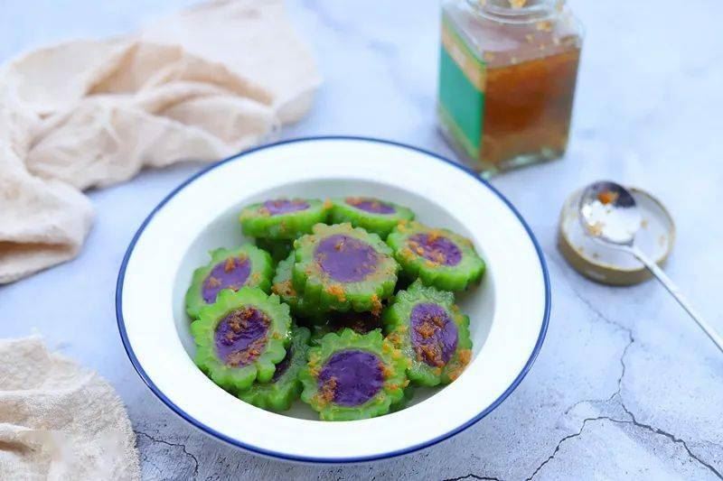 5.往苦瓜里填满紫薯泥,压紧实,切片装盘即可;