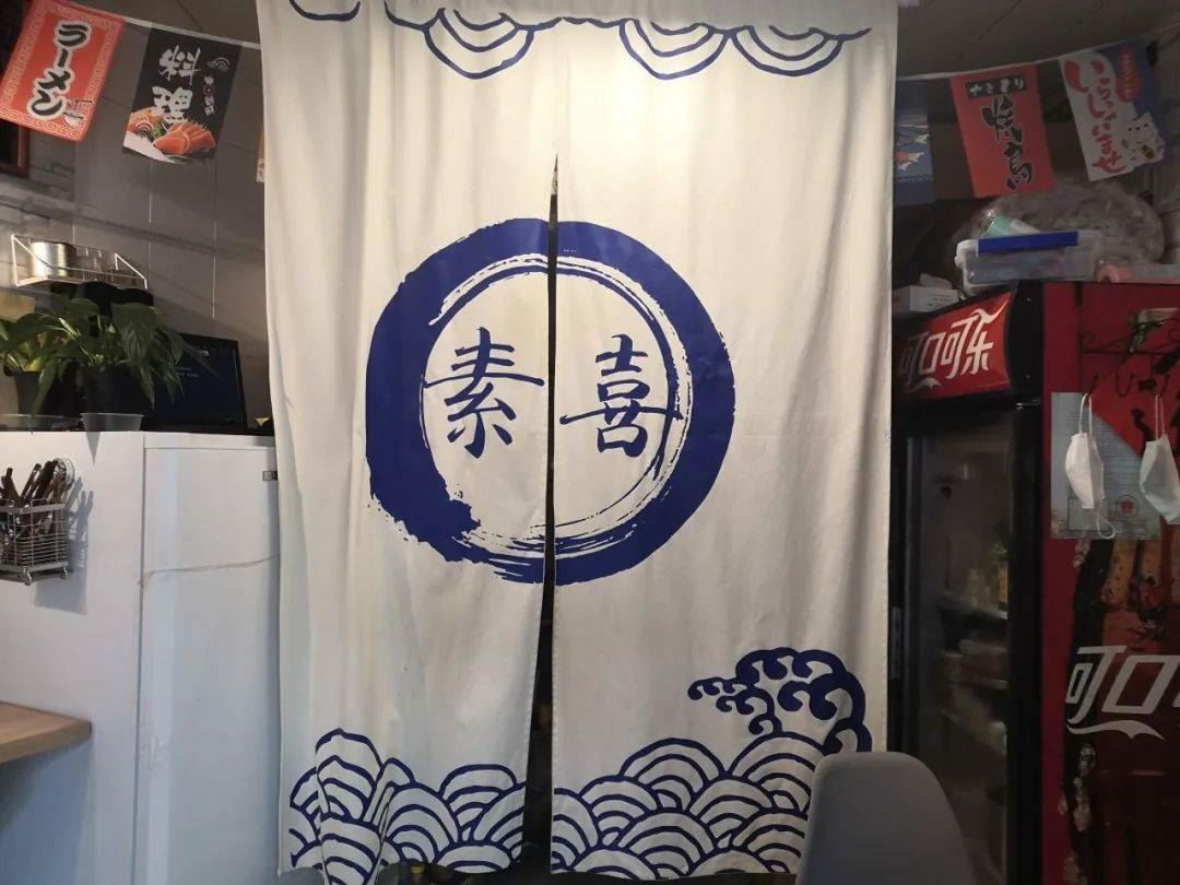 一进店里映入眼帘的就是一个标有“素喜”字样的帘子,屋里不大也就十几平,将将放了一张四人方桌和几个吧台椅。店里放着舒缓的音乐,让人在踏入店铺的时候就放松下来。