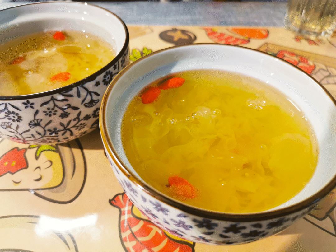 大朵的银耳搭配枸杞红枣熬制,有一点点浓稠,口感非常好。真是想不到连一碗汤都如此精良。