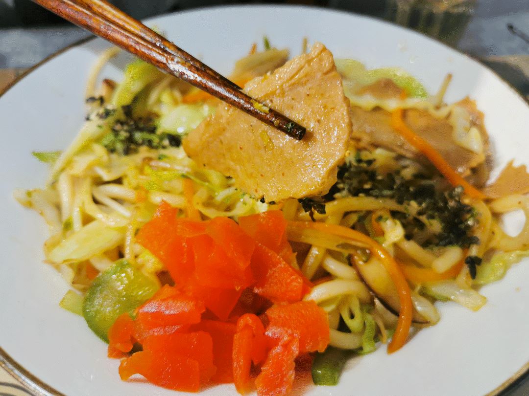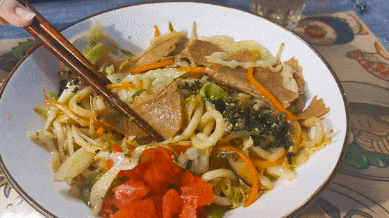搅拌均匀,夹起一筷子,吸溜~劲道爽滑的乌冬面搭配多种配菜,浓浓的酱汁充盈口腔,这滋味真的绝了!
